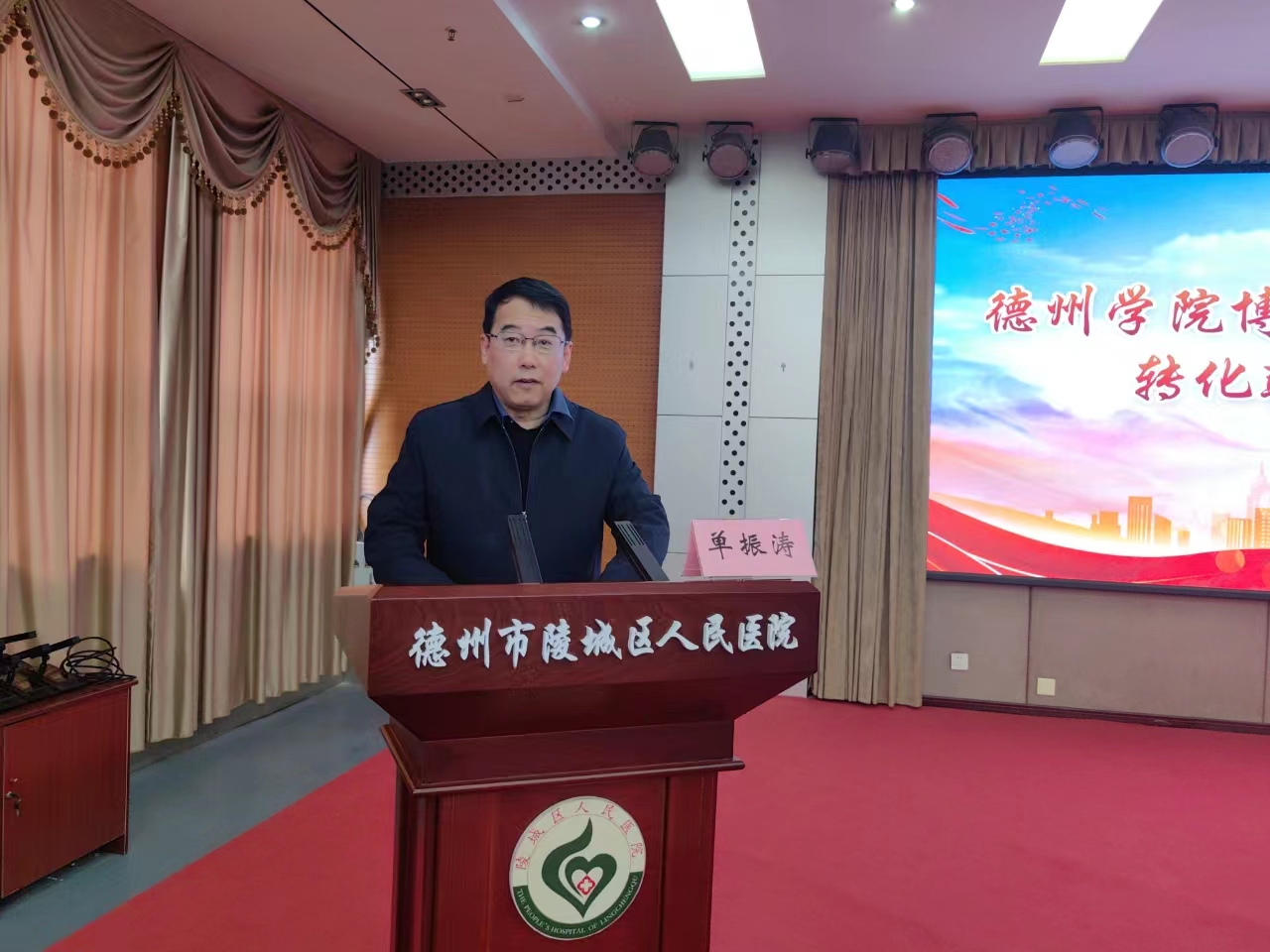 单振涛在致辞中表示,“一站一室”的成立是推动中医药传承创新发展的有力举措, 为“校院企”提供了一个良好的学习、科研、 实践和转化平台。希望“院校企”三方按照共建共享、资源融合的原则,坚持项目化、平台化运行,聚焦德州中医药领域,强化特色,形成优势,促进中医药“人才环”“服务环”“产业环”的协同发展。通过共建培养一批高素质应用创新型医药专业人才,形成一批中医药和健康产业应用技术创新成果,为区域经济社会发展提供有力的人才支持和智力支撑,为健康中国建设做出积极贡献。