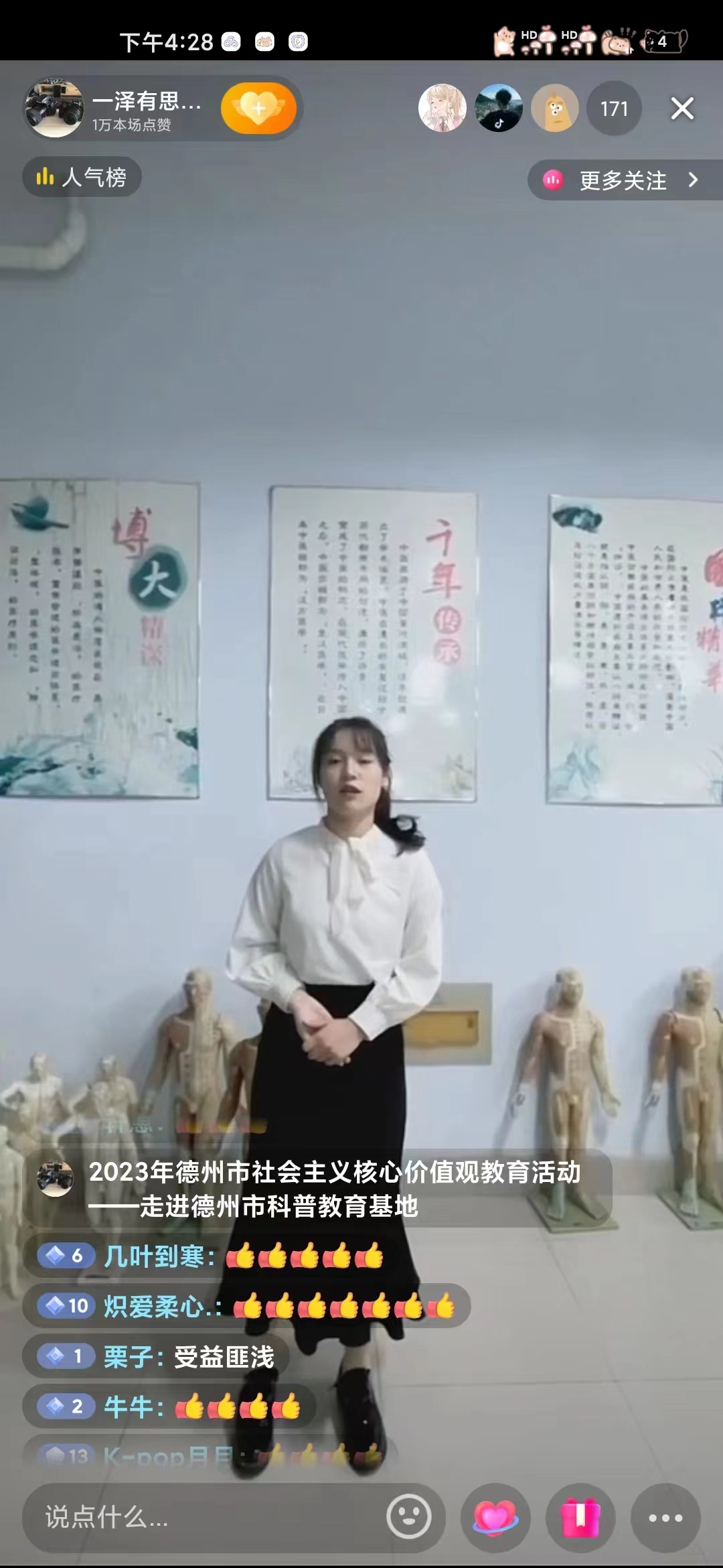 为加强社会主义核心价值观教育,1946伟德国际源自英国医药与护理学院于2023年1月11日在抖音平台开展了2023年德州市社会主义核心价值观教育活动-走进德州市科普教育基地线上直播活动,医药与护理学院300余名大学生参加。