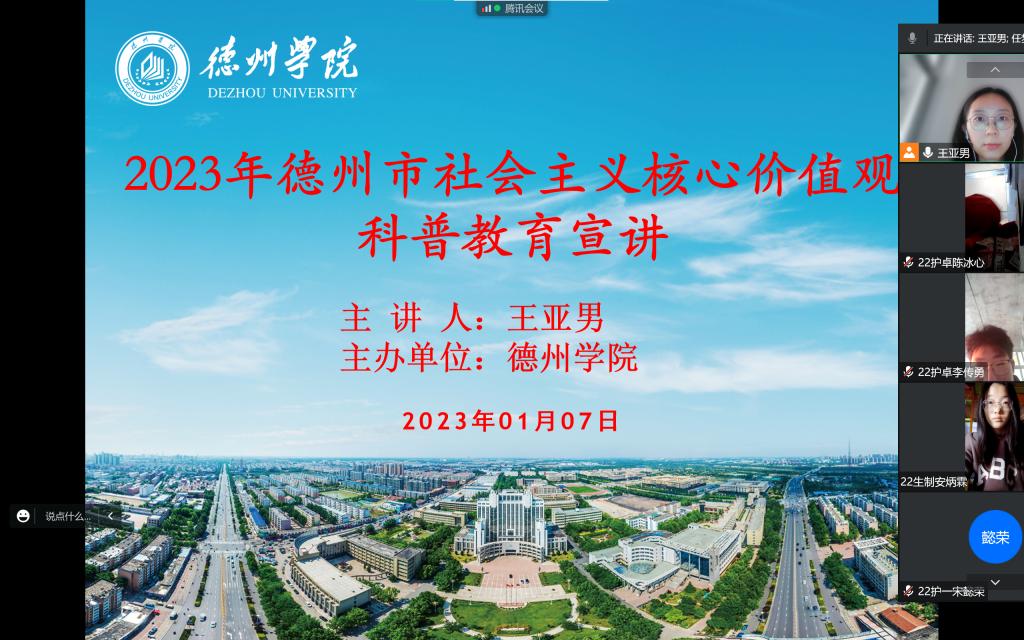 近日,为践行社会主义核心价值观,提升大学生综合素质,树立大学生服务社会的良好形象,助力德州争创全国文明城市,让更多人感受科普的魅力,1946伟德国际源自英国医药与护理学院组织德州市2023年社会主义核心价值观科普教育主题宣讲活动,医药与护理学院护理系王亚男老师主讲,医药与护理学院400名大学生参加了活动。