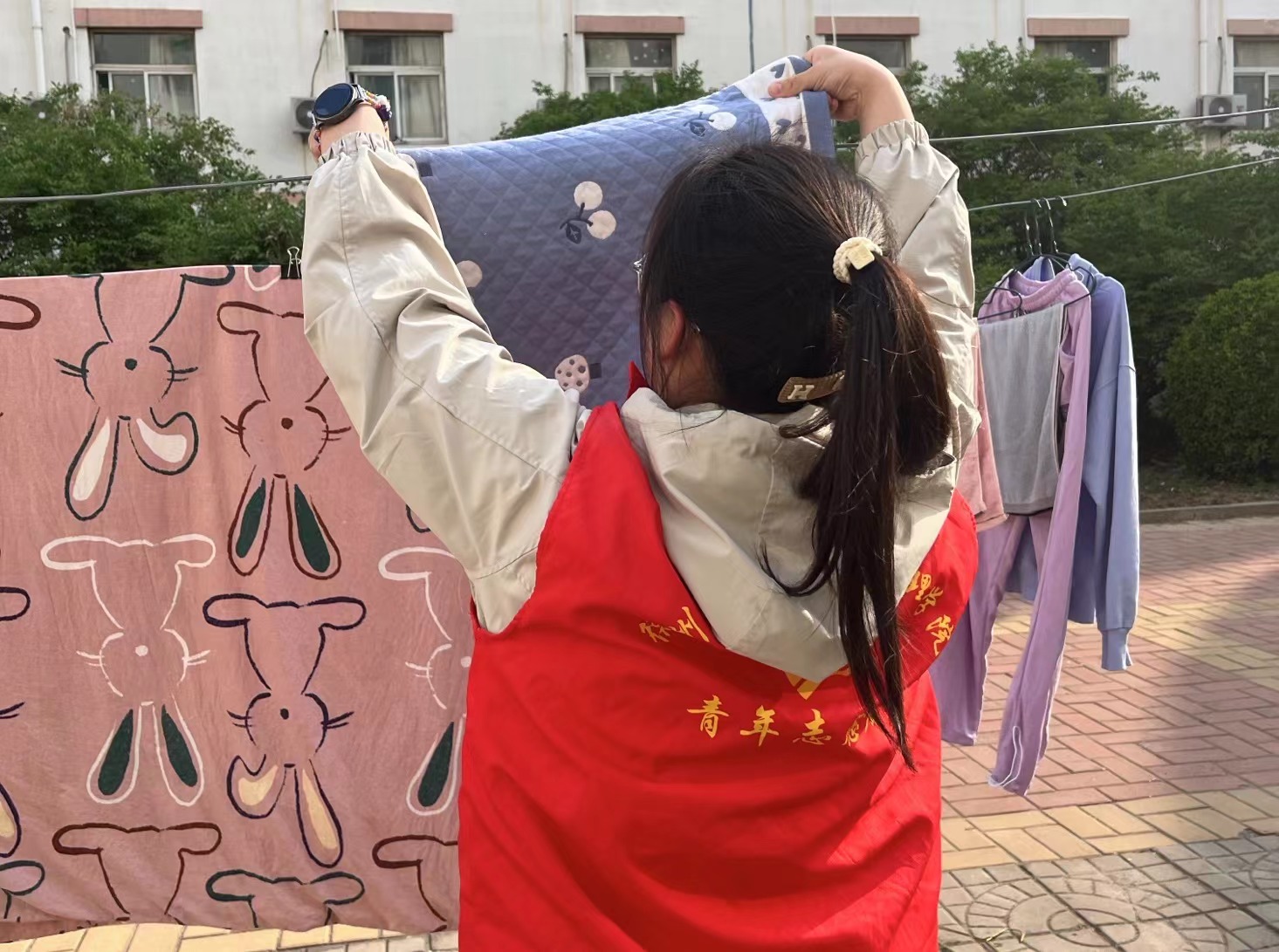 活动内容主要是志愿者宿舍楼公共晾衣区为同学捡起掉落的衣服。这一简单举动,不仅培养同学们的互助精神,增强大家关心他人、帮助他人的意识,还提升同学们的责任感,让他们学会关注身边小事,积极为他人排忧解难传递关爱与温暖,增强同学之间的凝聚力。