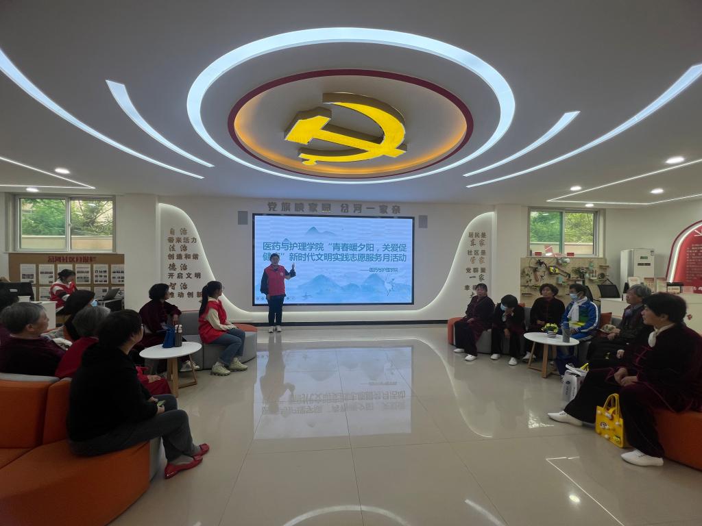 为深入学习宣传贯彻党的二十大精神,传承“五四”精神,进一步提高社区居民的健康观念,提升中老年人的健康保健意识,传播健康理念,倡导良好的生活方式。医药与护理学院学生党员、南丁格尔志愿服务队于5月9日在岔河社区开展“青春暖夕阳,关爱促健康”的知识讲座及教学八极拳活动。
