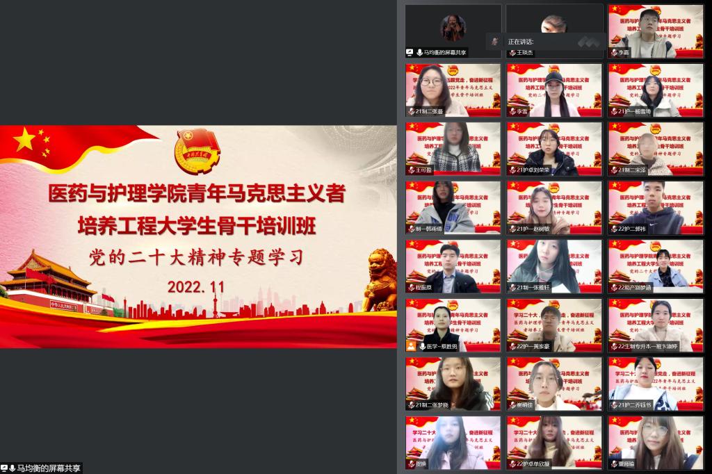 为深入学习宣传贯彻党的二十大精神,结合医药与护理学院青年马克思主义者培养工程实施意见,11月18日,医药与护理学院2022冬季青马班学院开展党的二十大精神专题学习,团委书记蔡胜男做党的二十大精神宣讲,全体青马学员参加。